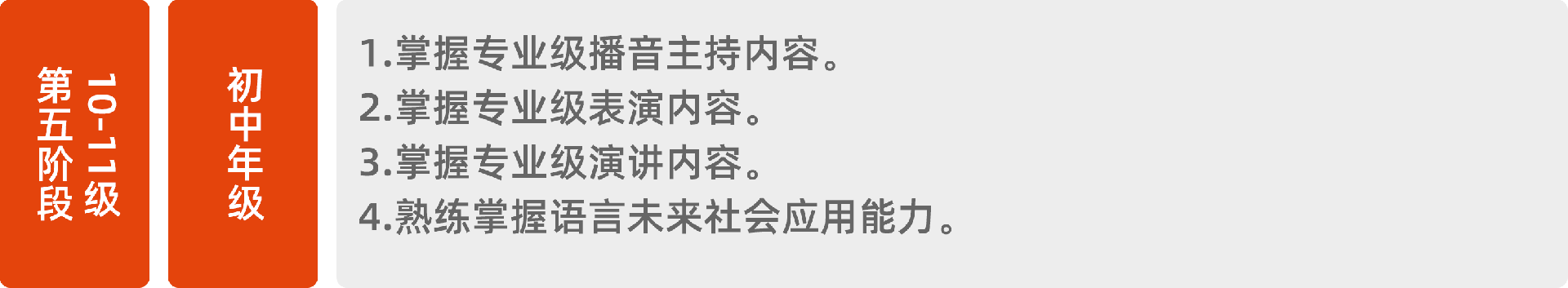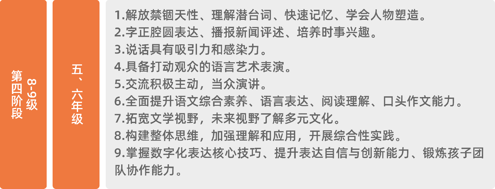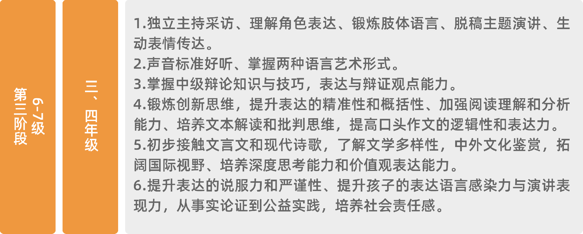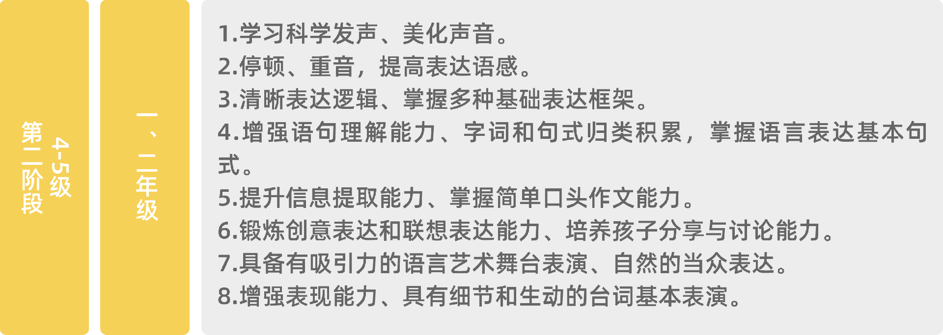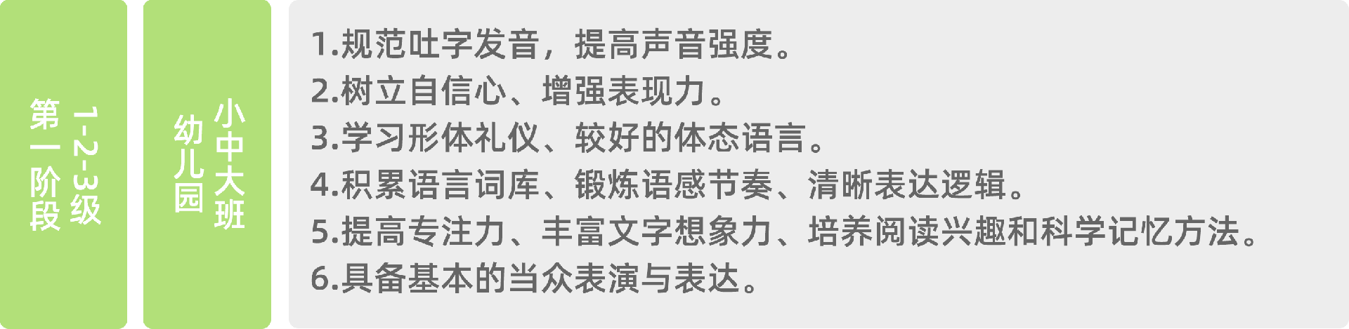 1.学习科学发声、美化声音;2.停顿、重音,提高表达语感;3.清晰表达逻辑、掌握多种基础表达框架;4.增强语句理解能力、字词和句式归类积累,掌握语言表达基本句式;5.提升信息提取能力、掌握简单口头作文能力;6.锻···